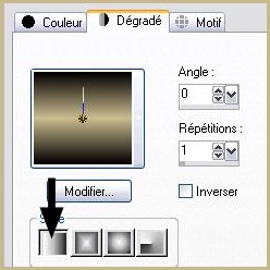 2 - Ouvrir une image transparente de 850 et 550 pixels Placer en avant-plan la couleur #000000 et en arrière-plan la couleur # cabc8fConfigurer un dégradé linéaire angle: 0°/Répétition: 1