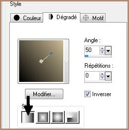 2 - Placer en avant-plan la couleur #cbbc95 et en arrière-plan la couleur #000000 Configurer un dégradé linéaire angle: 50°/Répétition: 0/Inverser coché