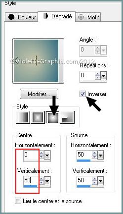 2 - Placer en premier-plan la couleur #2e6c81 et en arrière-plan la couleur #c9c7aa Dans la Palette de Style Configurer un dégradé linéaire angle: 0°/Répétition: 0/Inverser coché