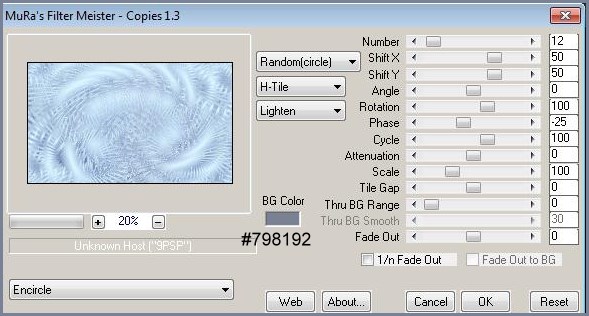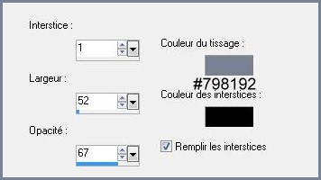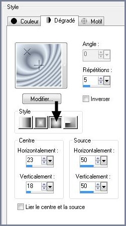 2 - Placer en avant-plan la couleur #e9f3f9 et en arrière-plan la couleur #798294 Dans la Palette de Style Configurer un dégradé halo/Répétitions : 5 horiz. 23/50 /vertical 18 /50