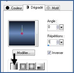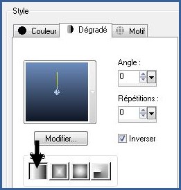 8 - Placer en avant-plan la couleur #6d8dbe et en arrière-plan la couleur #111725 Dans la Palette de Style Configurer un dégradé linéaire angle: 0°/Répétition: 0/Inverser coché