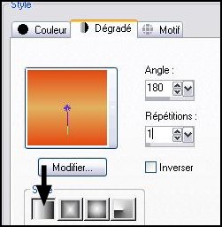 4 - Placer en avant-plan la couleur #e44911 et en arrière-plan la couleur #e2b25f Dans la Palette de Style Configurer un dégradé linéaire angle: 180°/Répétition: 1