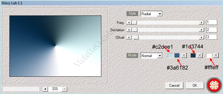 2 - Ouvrir une image transparente de 900 x 600 pixels **Effets/Medhi/Wavy Lab réglages suivants :