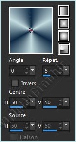 11 - Activer le calque supérieur ** Placer en premier-plan la couleur #0e2944 et en arrière-plan la couleur #c1dade Dans la Palette de Style Configurer un dégradé radial angle: 0°/Répétitions : 5 /Inverser non coché