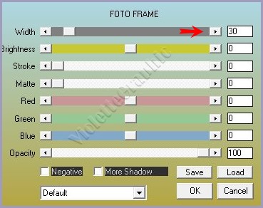 18 - Image/Ajouter des bordures : 30 pixels couleur #a09dbcSélectionner la bordure avec la baguette magique **Effets/Effets d'éclairage/projecteurs réglages précédents Sélection/Inverser **Effets/Effets 3D/Ombre Portée : 0/0/80/40/couleur #000000 19 - Placer le filigrane de Lica Cida **Placer votre signature
