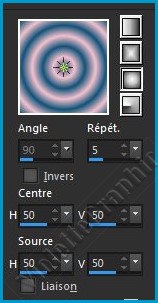 **Calques/Nouveau calque **Remplir la sélection de dégradé halo/Répétitions : 5/Inverser non coché Centre: hor.= 50/ vert.= 50 Source: hor.= 50/ vert.= 50