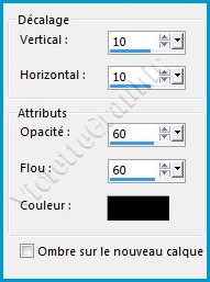 **Effets/Effets 3D/Ombre Portée : 10/10/60/60/couleur #000000**Répéter l'ombre portée avec les valeurs négatives : - 10