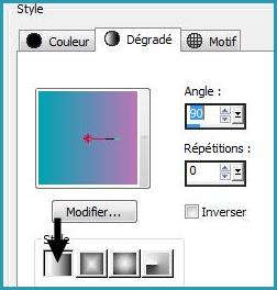 1 - Placer en premier-plan la couleur #01a3b2 et en arrière-plan la couleur #bb75b5Dans la Palette de Style Configurer un dégradé linéaire angle: 90°/Répétition: 0