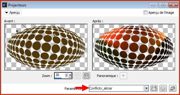 4 - Effets/Effets/d'éclairage/Projecteurs : appliquer le preset Conflicto_aliciar.PspScriopt