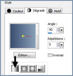 1 - Placer en premier-plan la couleur #3a4e71 et en arrière-plan la couleur #88a0b8 Dans la Palette de Style Configurer un dégradé linéaire angle: 90°/Répétition: 0