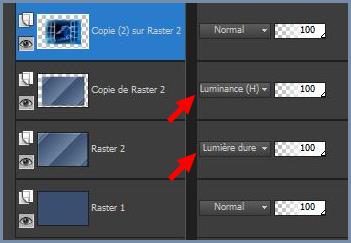 9 - Dans la Palette des calques Placer le calque 2 en Mode de fusion : Lumière dure et la copie du calque 2 en Luminance Héritée