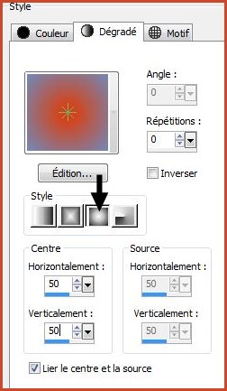 1 - Placer en premier-plan la couleur #e63800 et en arrière-plan la couleur #6e8abc Dans la Palette de Style Configurer un dégradé halo/angle: 0°/Répétition: 0