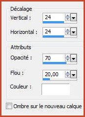 8 - Effets/Effets 3D/Ombre Portée : 24/24/70/20/couleur #ffffff