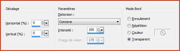 10 - Effets/Effets de Distorsion/Distorsion de l'objectif réglages suivants :
