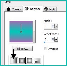 **Remplir de dégradé linéaire/angle: 0° /Répétition: 1/Inverser non coché premier-plan couleur # a06caf/ arrière-plan couleur #01c8b8