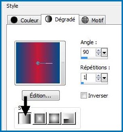 5 - Calques/Nouveau calque Remplir de dégradé linéaire/angle: 90° /Répétition: 1 premier-plan couleur #004d8b / arrière-plan couleur #c91836