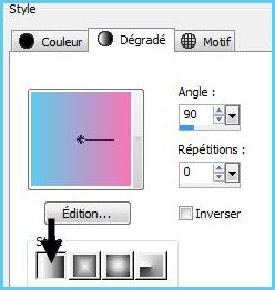 3 - Calques/Nouveau calque Remplir de dégradé linéaire/angle: 90° /Répétition: 0/Inverser coché premier-plan couleur # 60cbeb / arrière-plan couleur #f775b6