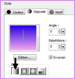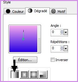 Remplir de dégradé linéaire angle: 0°/Répétition: 0/inverser cochépremier-plan couleur #2701e3 / arrière-plan couleur #f4a8ed