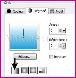 2 - Calques/Nouveau calque Remplir de dégradé formé des couleurs : premier-plan couleur # 1b9dd9/ arrière-plan couleur #ffffffconfiguré : linéaire/angle: 0°/Répétition: 0