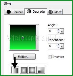 **Remplir de dégradé formé des couleurs : premier-plan couleur #16fe3a/ arrière-plan couleur #000000 configuré : linéaire/angle: 0°/Répétition: 1
