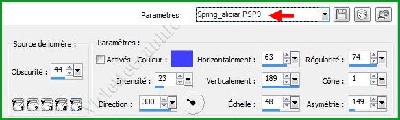 8 - Effets/Effets d'éclairage/projecteurs réglages suivants : Appliquer le preset Spring_aliciar PSP9