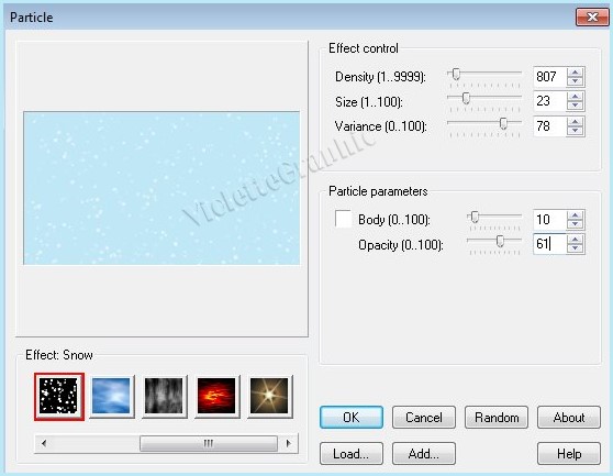 1 - Ouvrir une image transparente de 900 x 500 pixels 2 - Remplir de couleurs #c0e7f63 - Effets/Ulead Particle/ Snow réglages suivants :