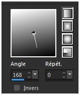 *** **Ouvrir les tubes , les dupliquer et fermer les originaux Placer en premier-plan la couleur #ffffff et en arrière-plan la couleur #000000Dans la Palette de Style Configurer un dégradé linéaire angle: 168°/Répétition: 0/Inverser non coché