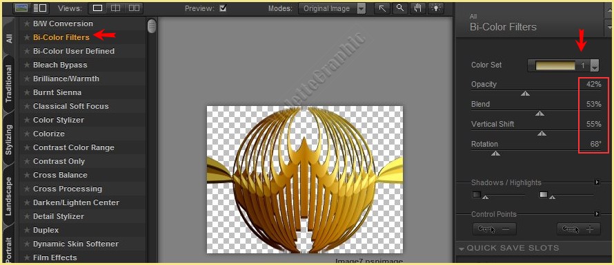 11 - Effets/Nick Software /Color Effex Pro 3.0 Complete/ Bi-Colors Filters réglages suivants : Color Set/ Green/Brown/1