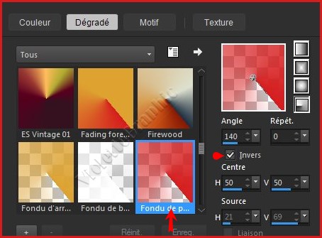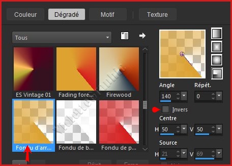 2 - Remplir de fondu de dégradé radial premier-plan angle: 140°/Répétition: 0/Inverser coché