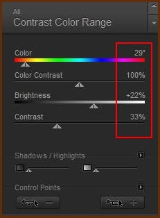 Réglages : C 29% / C.C 100%/ B +22% /C 33%