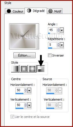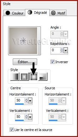 configuré : halo/angle: 0°/Répétition: 0/inverser coché Centre Hor.= 50/ Vert.= 50