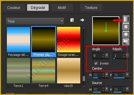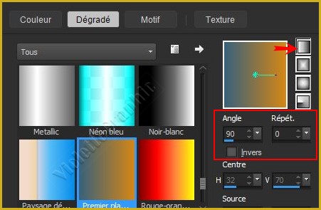 dégradé linéaire/angle: 0/Répétition: 1/ case inverser cochée