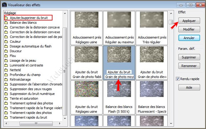 : Effets/Visualiseur des effets/ Ajouter du bruit: grain de photo moyen/Appliquer **Effets/Effets