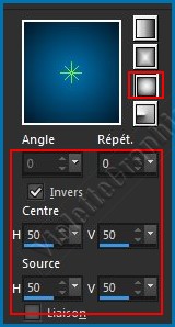 dégradé Halo /Répétition: 0 /case Inverser cochée Centre: hor.=50/ vert.=50 Source: hor.=50/ vert.=50