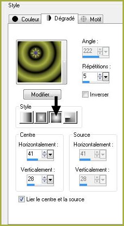 2 - Placer en avant-plan couleur #a7af42 /arrière-plan couleur #000000Configurer un dégradé linéaire halo/Répétitions: 5 configuré ainsi
