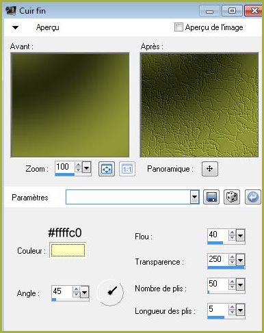 5 - Effets/Effets de Textures/ Cuir fin réglages suivants :