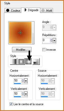 2 - Placer en avant-plan la couleur #9b1c00 et en arrière-plan la couleur #f7b94c Dans la Palette de Style Configurer un dégradé linéaire angle: 0°/Répétition: 0
