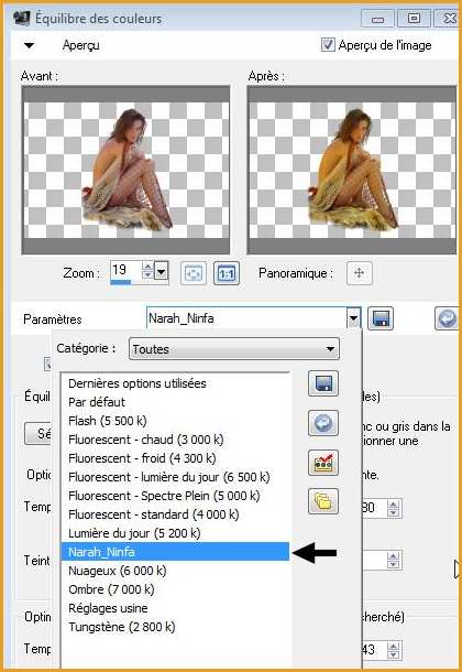 **Réglages/Equilibre des couleurs rechercher le preset Narah_Ninfa/OK