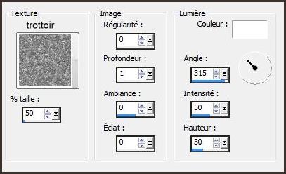 7 - Effets/Effets de Textures/Texture trottoir( Cotel_15_044) réglages suivants :