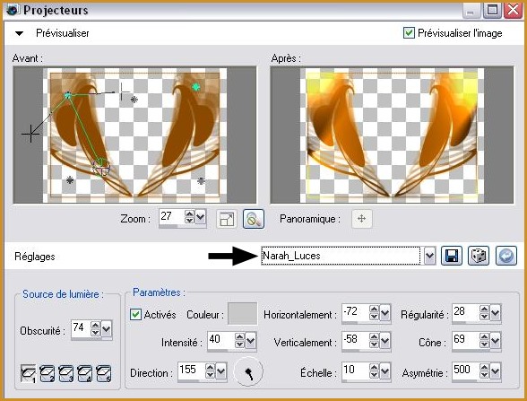 20 - Activer le calque du groupe-raster 3 Effets/Effets d'éclairage/projecteurs :Localiser le preset Narah_Luces et OK