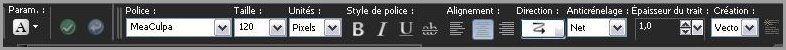 13 - Activer l'outil Texte/Police MeaCulpa.ttf/taille : 120/trait : 1/vectoriel couleur avant-plan #232324 /couleur arrière-plan #d7d5d6
