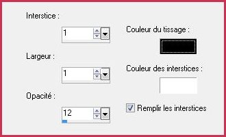 26 - Calques/Nouveau calque Remplir de couleur #c63050 Effets/Effets de Textures/Stores réglages suivants :