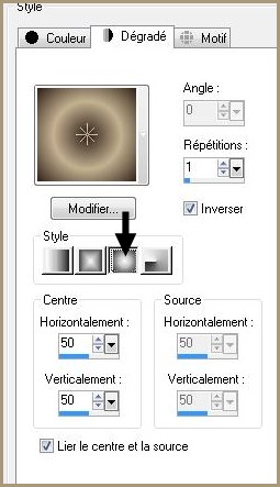 2 - Placer en avant-plan la couleur #c4b191 et en arrière-plan la couleur #2f2017Dans la Palette de Style Configurer un dégradé halo/angle:0/Répétition: 1