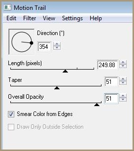 15 - Effets/Eye Candy 4000/ Motion Trail réglages suivants : 354/249.88/51/51/Smear Colof from Edges coché
