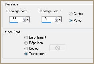 17 - Activer le calque supérieur Ouvrir le tube Betsie_381_9 febr.2010 .pspimageModifier/Copier/Modifier/Coller comme nouveau calque Image/Miroir Effets/Effets d'image/décalage :