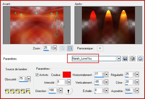 7 - Couches/Dupliquer**Activer le calque supérieur Effets/Effets d'éclairage/projecteurs : preset Narah_LoveYou