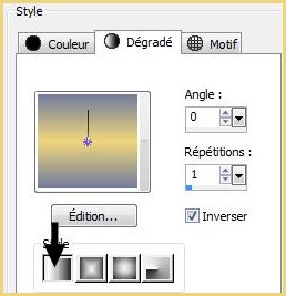 3 - Calques/Nouveau calque Placer en premier-plan la couleur #efd67b et en arrière-plan la couleur #737b9cDans la Palette de Style Configurer un dégradé linéaire/angle: 0/Répétition: 1/Inverser coché