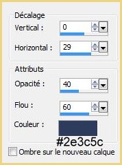 40 - Effets/3D effets/ombre portée : 10/10/70/15.00/# 2e3c5c Appliquez ensuite l'ombre avec ces valeurs : -10 /-10/70/15.00/# 2e3c5c **Sélection/Ne rien sélectionner