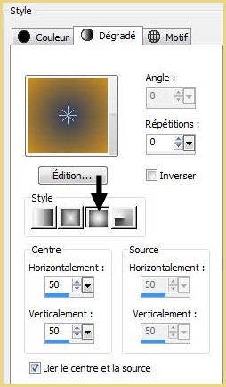 **Calques/nouveau calque Remplissez la sélection avec un dégradé halo/ Angle: 0/répétition: 0 En utilisant les mêmes couleurs #ce8f21 et #2e3c5c
