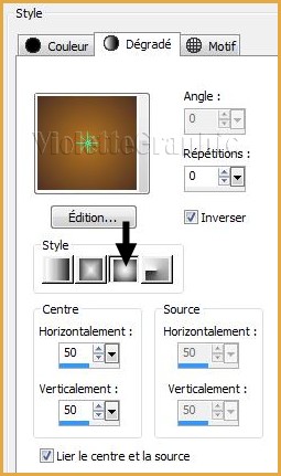 2 - Remplir de dégradé formé des couleurs :premier-plan couleur #4d3123/ arrière-plan couleur #b67421 configuré : halo/angle: 0°/Répétition: 0/inverser coché